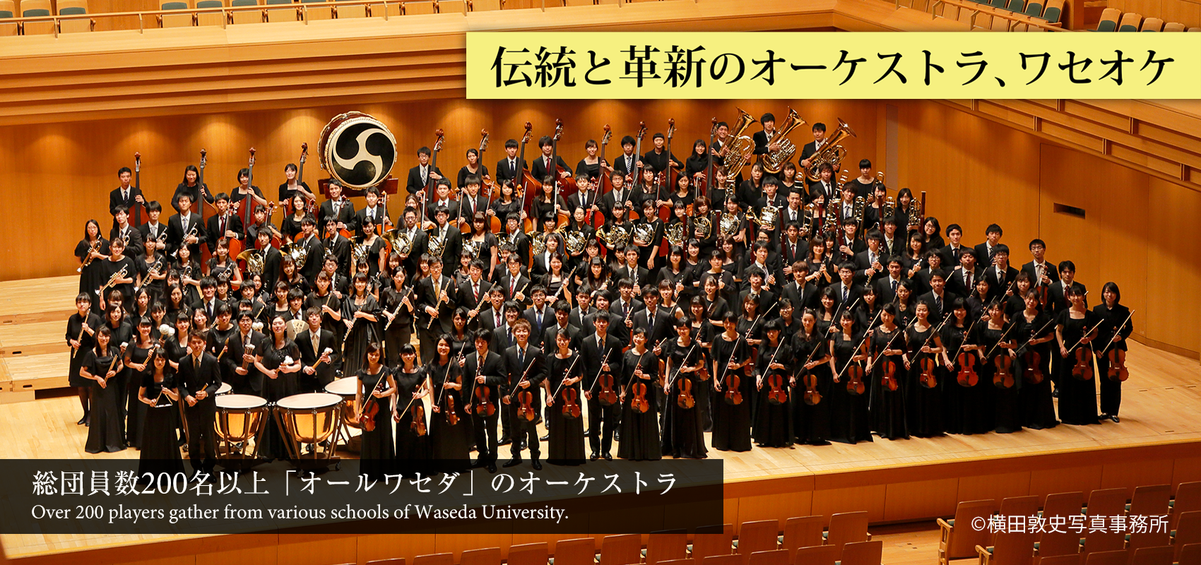 早稲田大学交響楽団は、「ワセオケ」の愛称で親しまれる早稲田大学の公認オーケストラです。1913年に創立された当楽団は、公認オーケストラとしては唯一、同大学の学部学生のみで構成されており、総団員数は約300名に上ります。年4~5回の主催公演、入学式や卒業式をはじめとする早稲田大学公式行事・文化事業における演奏を主な活動としており、このほか年間20~30件の依頼演奏も行っています。2023年度には、創立110周年を記念し、ザ・シンフォニーホールにて大阪特別公演を行いました。